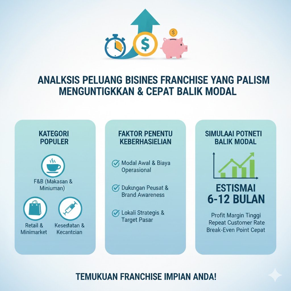 Memilih investasi bisnis di tahun 2026 memerlukan ketelitian dalam melihat tren pasar dan efisiensi operasional. Bisnis franchise atau waralaba tetap menjadi pilihan utama bagi investor pemula maupun profesional karena menawarkan sistem yang sudah teruji. Artikel ini akan membahas analisis mendalam mengenai sektor mana saja yang diprediksi memberikan keuntungan maksimal serta strategi agar modal yang Anda tanamkan dapat kembali dalam waktu singkat.